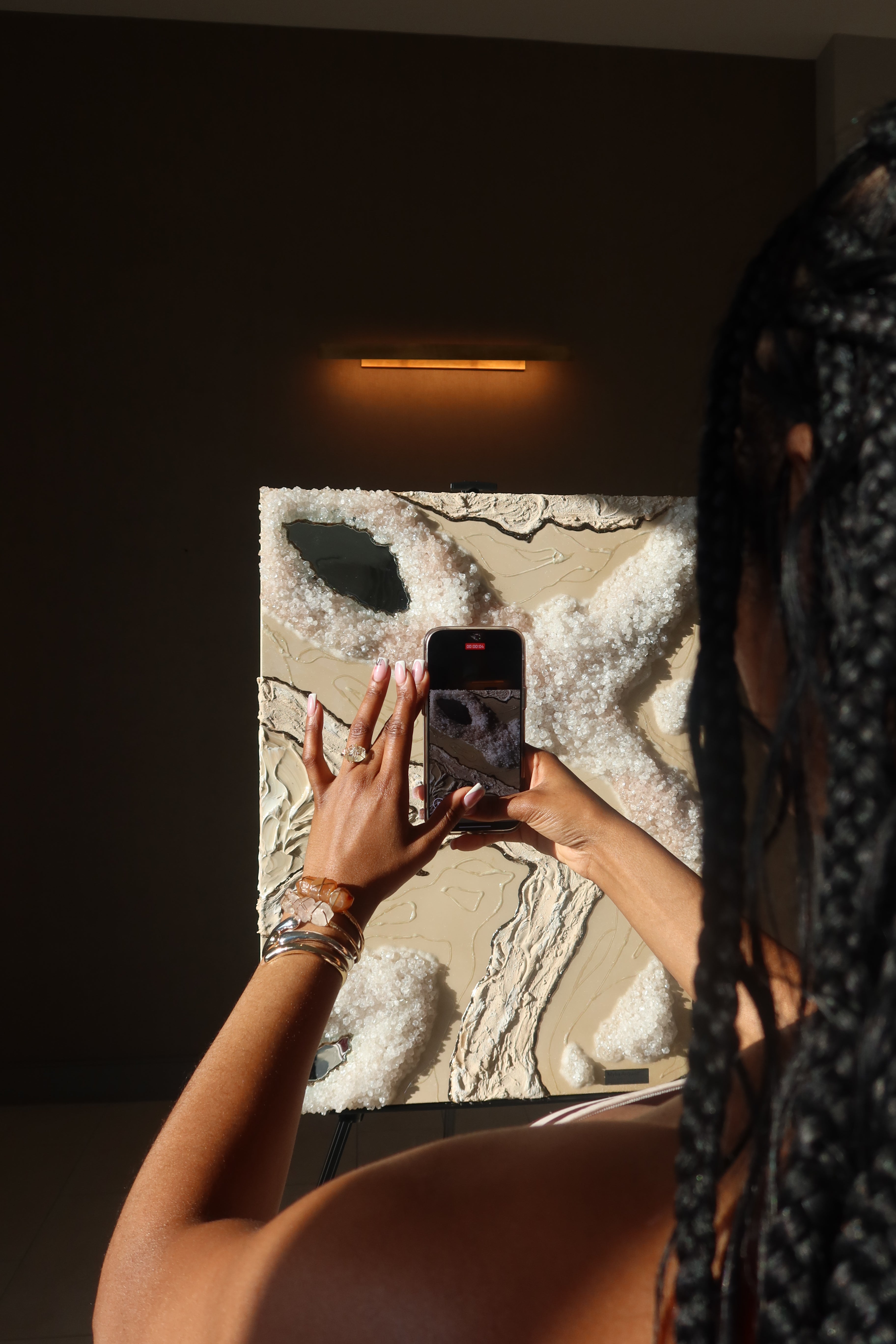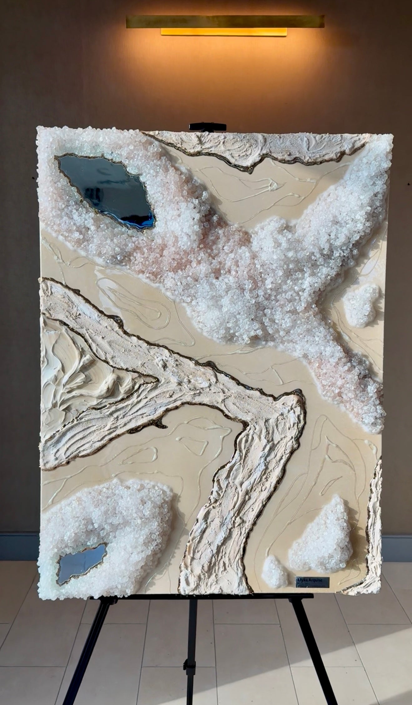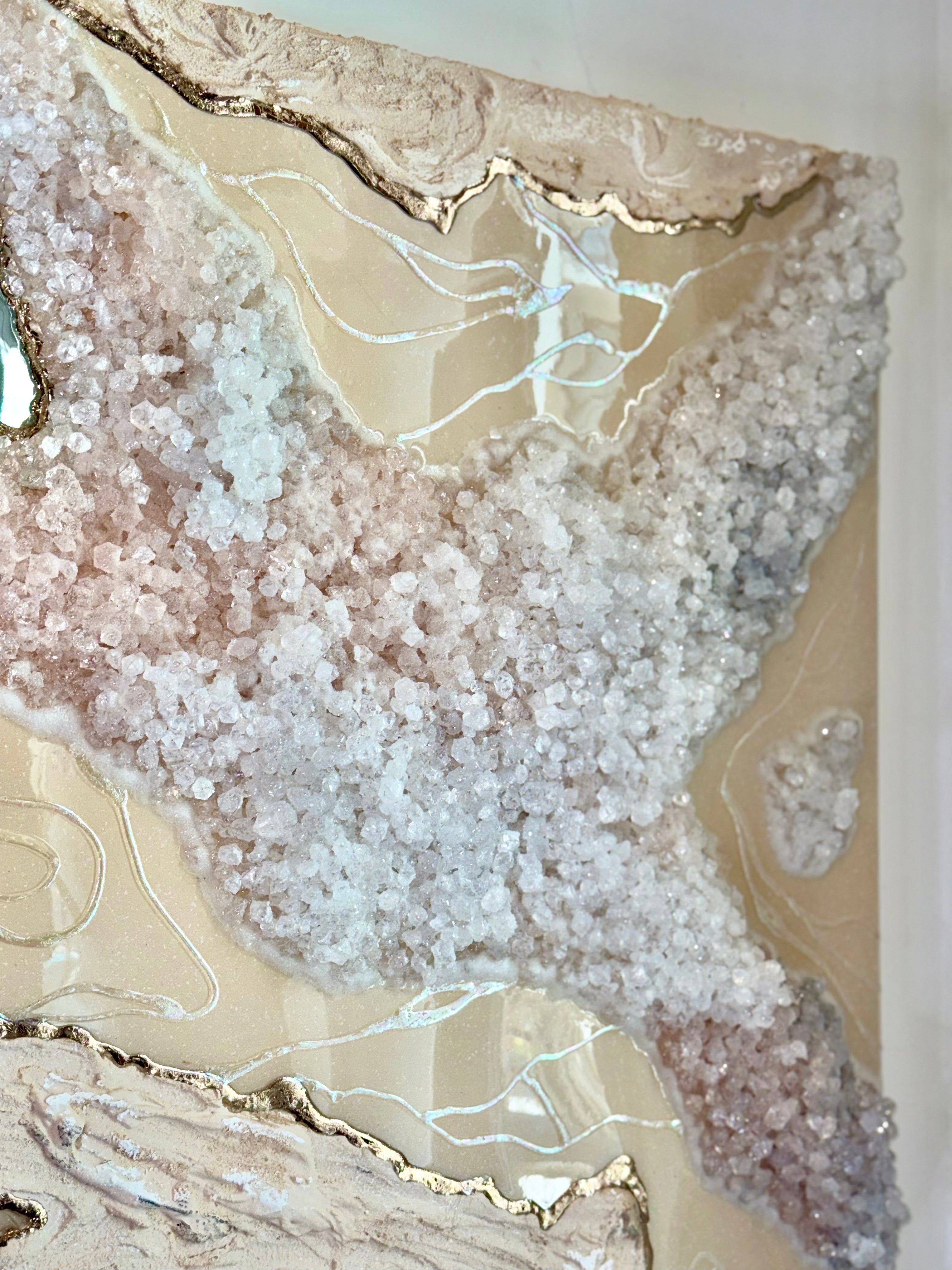 "Salt and Stone" blends raw textures with soft shimmers. Both crystals and stone create a grounded foundation, while iridescent swirls add movement and light throughout. This beautiful piece explores contrast - earthy, ethereal, structured and fluid.